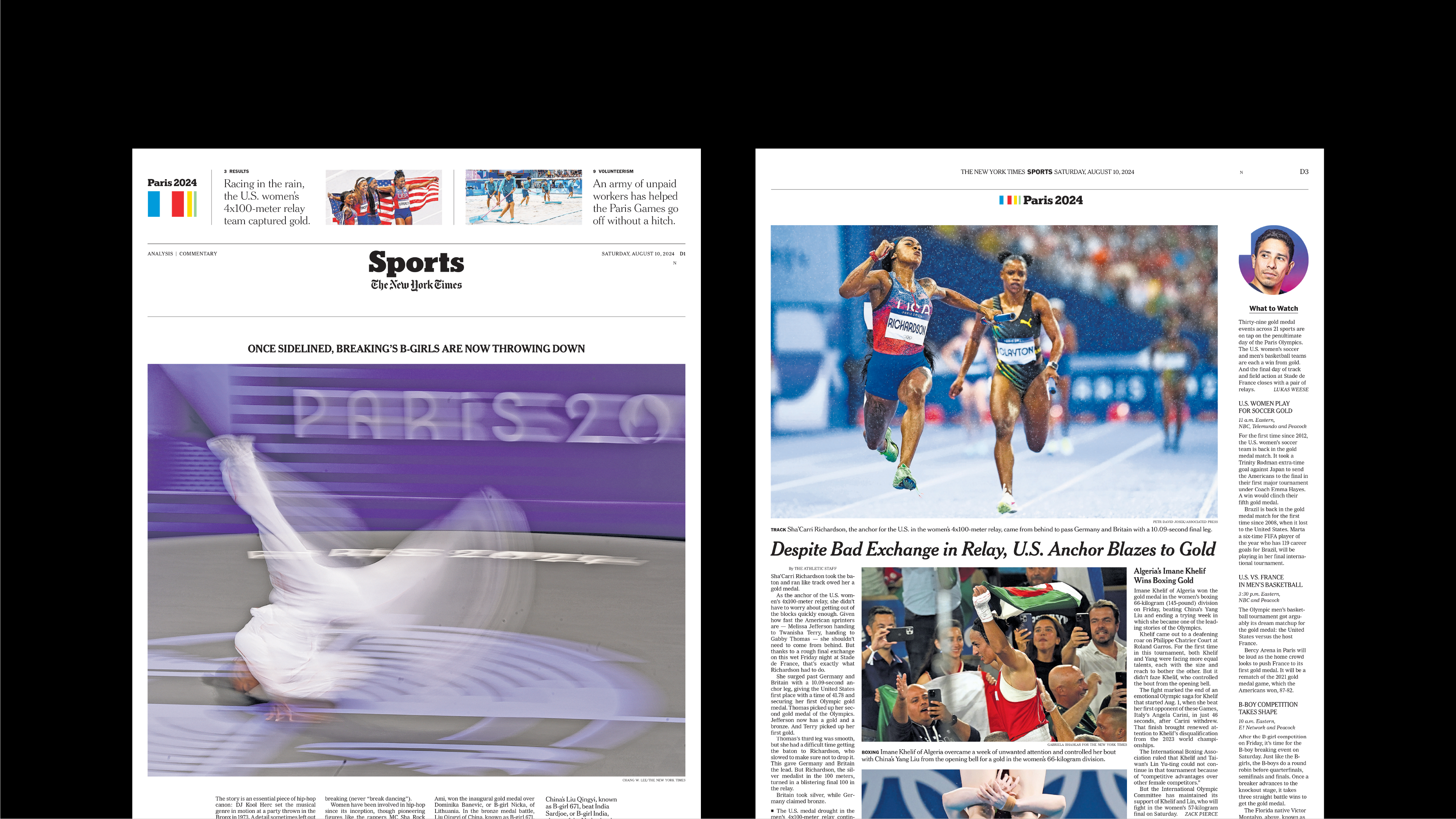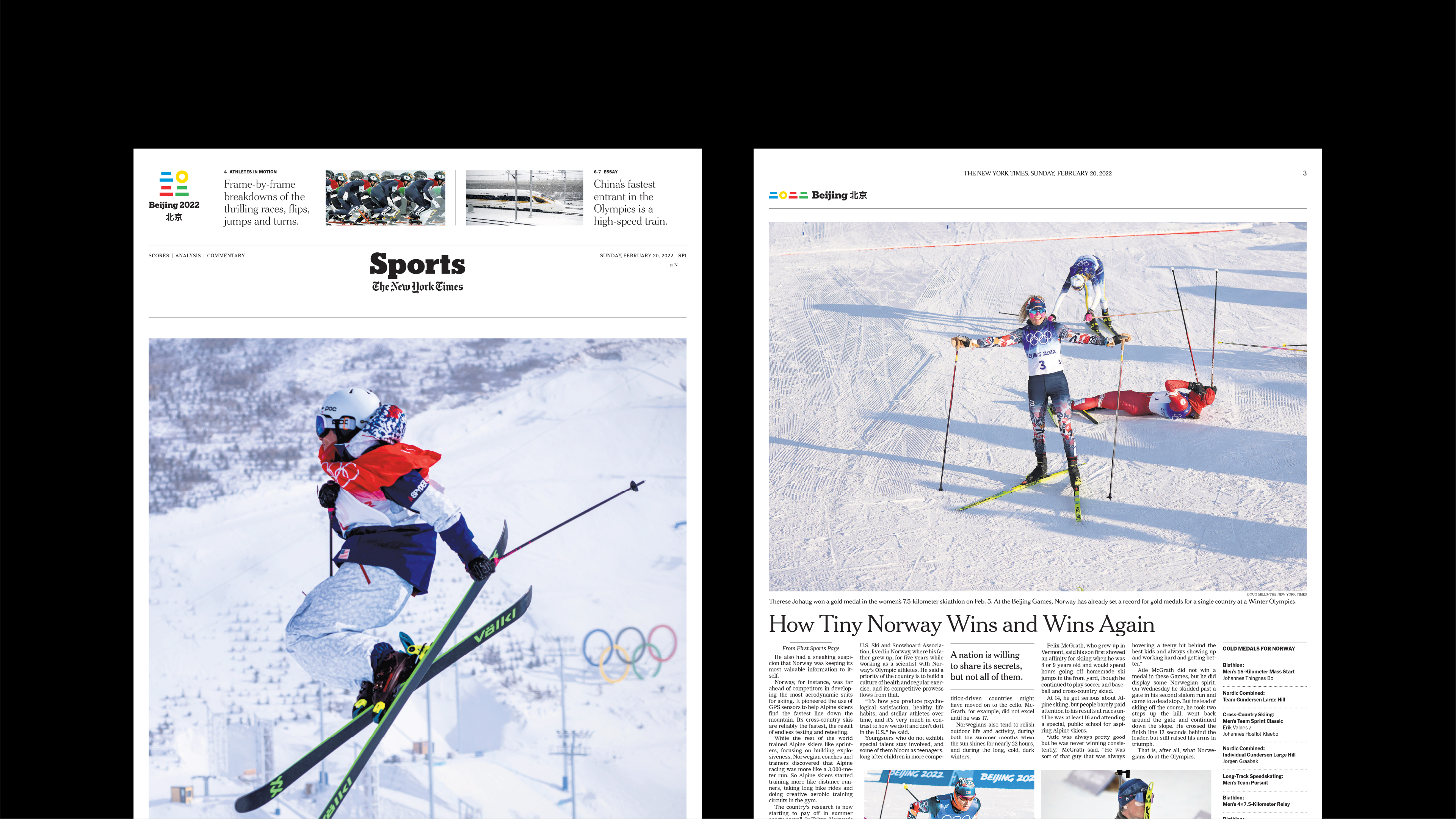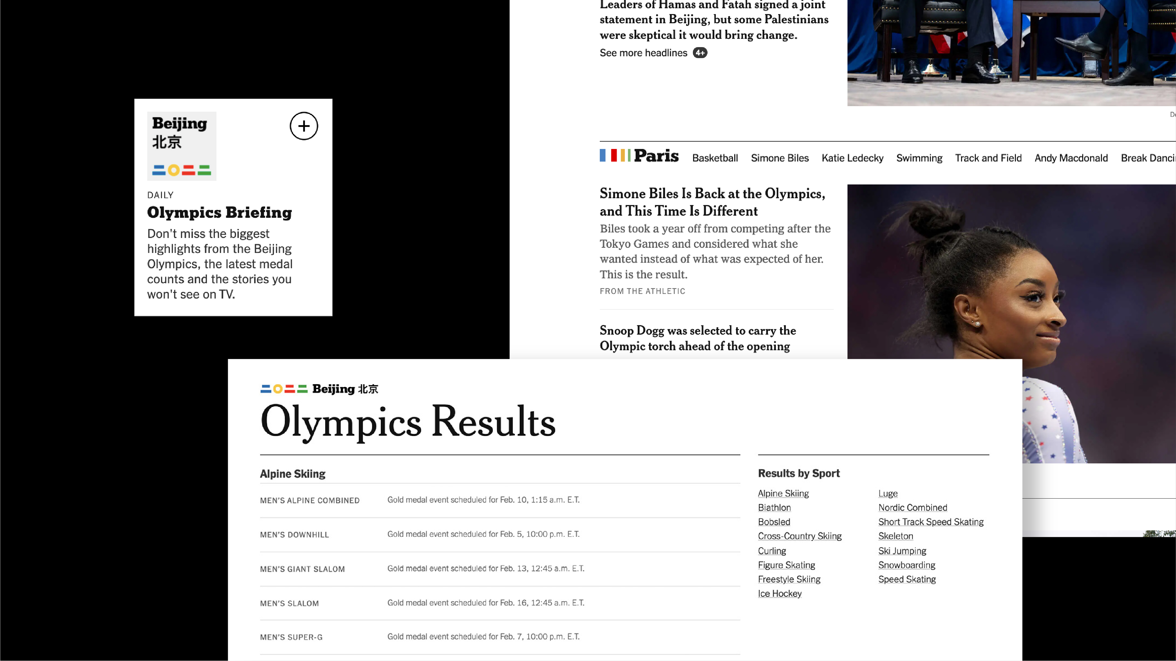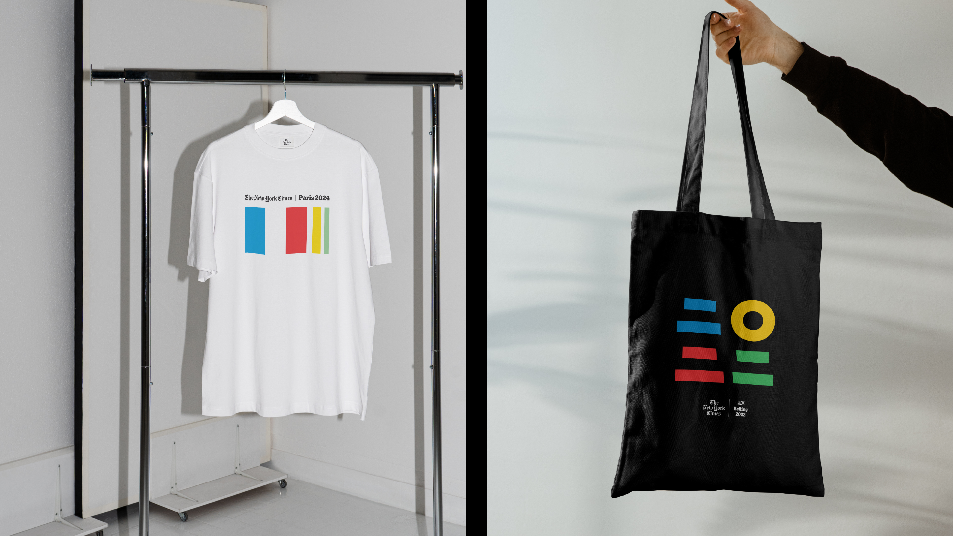 Identity for New York Times Olympics coverage — 2022 Beijing Winter Olympics and 2024 Paris Olympics. Identity used across: merchandise for journalists on the ground, printed and digital sports news and an Olympics Briefing newslett